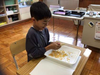 10/16(木)授業の様子(4年生) 公開日 2025/10/16 更新日 2025/10/16 各学年から 4年生は、図工で読書感想画に取り組んでいます。色を丁寧に塗り重ねたり、写真を切り抜いたりして、思いが伝わる絵になるように工夫しています。 あさがお学級は、生活単元でポップコーン用のとうもろこしの実を取っています。この後、数を数えるそうです。何粒あるのでしょうか?