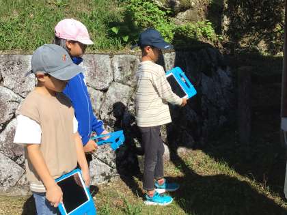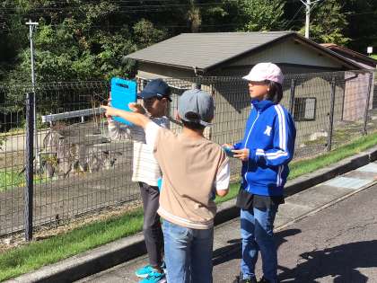 理科「季節と生き物」で、秋を探しています。トンボやカマキリ、トカゲ?、じっとのぞいているといろいろな生き物が見つかります。