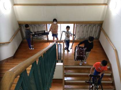 10/24(金)さわやかタイム(楽器運び) 公開日 2025/10/24 更新日 2025/10/24 各学年から 今日のさわやかタイムは、学芸会に向けて楽器を集会室に運びました。様々な楽器や譜面台等を協力して運びました。大きな木琴は分解して運んだため、集会室で組み立てました。木琴の構造を知ることができました。