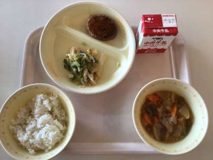 今日の給食は、大根と豚肉の煮物、照り焼きハンバーグ、ゴマ酢和え、ごはん、牛乳です。
