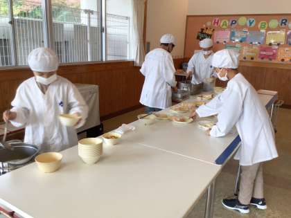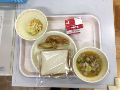 今日の給食は、スライスパン、あじフリッター、野菜カレーサンド(マヨネーズ風ドレッシング)、ポトフです。スライスパンにカレー味の野菜をはさんで食べました。給食当番は1か月で交代です。あと1週間がんばります。