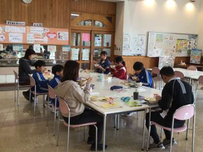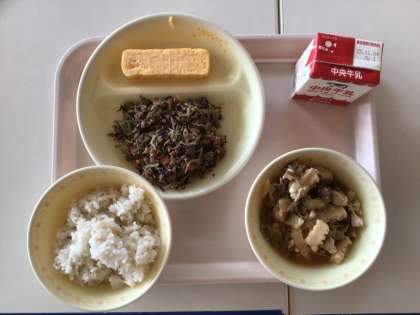 今日の給食は、すき焼き風煮、厚焼き卵、手作りふりかけ、麦ごはん、牛乳です。手作りふりかけには、まぐろ、ちりめんじゃこ、かつおぶし、ひじき、にんじん、ピーマンと、たくさんの食材が使用されて栄養たっぷりのふりかけです。今日は4年生が校外学習のため、いつもの半分のテーブルでの会食です。