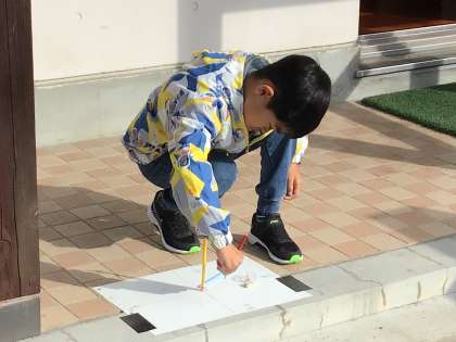 今日は晴れたかと思うと雲が多く漂うなど、朝は少し不安定な天気でしたが、少しずつ雲も途切れ、太陽の日差しが心地よく差すようになってきました。4年生が太陽の観察をしています。かげの動きを観察して日光の進み方についてみています。
