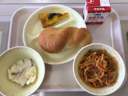 今日の給食は、イタリアンスパゲッティ、スパニッシュオムレツ、ツイストパン、フルーツヨーグルト、牛乳です。ツイストパンは、やわらかくて食べ心地がよいため人気があります。パンとスパゲッティとで炭水化物が多いように感じますが、子どもたちのエネルギー量としてはそれだけ必要であるということです。