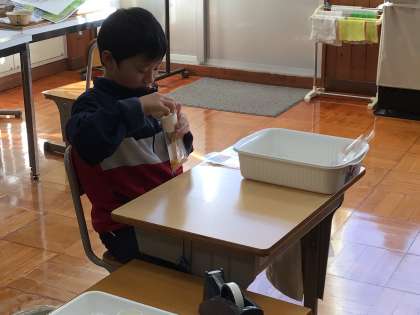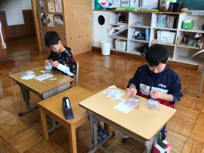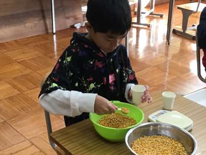 学芸会の時に販売するポップコーンの種の準備をしています。袋にシールを貼ったり、入れる量を測って袋に入れたりちょっとした作業ですが、正確に清潔にやると、案外手間がかかります。