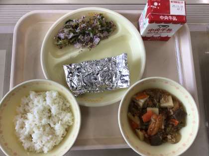 今日の給食は、根菜のそぼろ煮、たらの銀紙焼き、ゆかりあえ、ご飯、牛乳です。根菜のそぼろ煮には、大根、にんじん、ごぼう、こんにゃく、さやいんげん、里芋、じゃがいもでんぷんが入り、ゆかり和えには、キャベツ、白菜、小松菜、しそが入り、10種類もの野菜が入って栄養満点です。