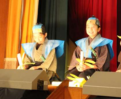 5年生2名は、2名とも家来の役と百姓の役になり、おもしろおかしい台詞や演技を行い、物語を盛り上げました