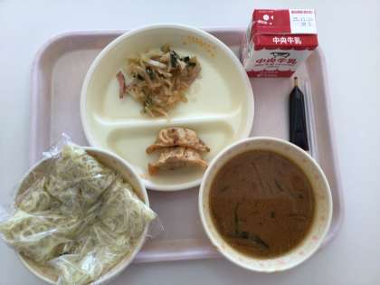 今日の給食は、豆乳味噌ラーメン、揚げぎょうざ、切り干し大根の中華サラダ、中華めん、コーヒー牛乳のもと、牛乳です。今日は約11種類の野菜が入っています。ボリュームも満点です。学校で食べるラーメンも美味しいです。