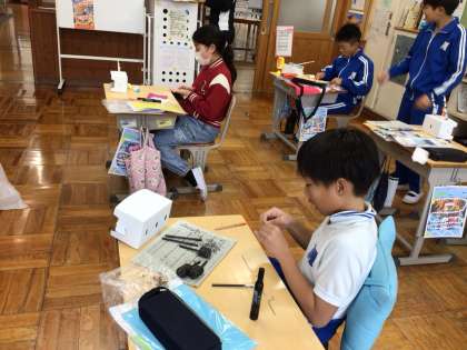 11/25(火)授業の様子(5・6年生) 公開日 2025/11/25 更新日 2025/11/25 各学年から 5・6年生は、図画工作で「くるくるクランチ」の製作に取り組んでいます。箱の中にある針金をまわすと、くるくるまわる動きをするため、この動きを利用して動きのある製作物を作っています。チンアナゴや列車、メリーゴーランドやマシュマロの形になるように色をつけています。 ひまわり学級では、円山学習でのまとめをパワーポイントを使って作っています。