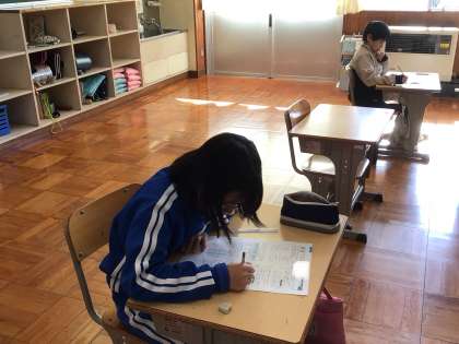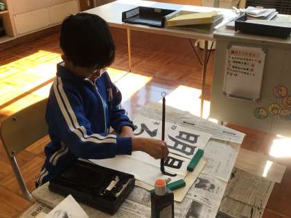 4年生は、算数(がい数)の確認テストに取り組んでいます。あさがお学級では、書写で書き初め(明るい声)の練習に取り組んでいます。