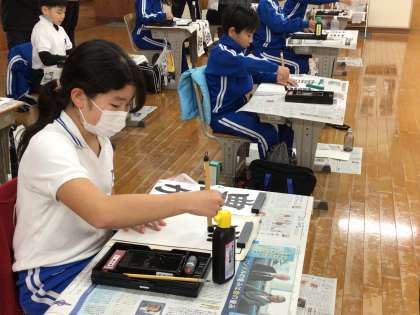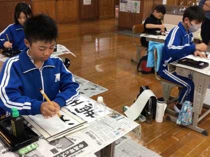 4年生は「明るい声」、5年生は「豊かな海」、6年生は「満点の星」の練習をしています。筆の入りや止め、はらいなどの筆遣い、字のバランスなどを教えていただきながら集中して練習しています。