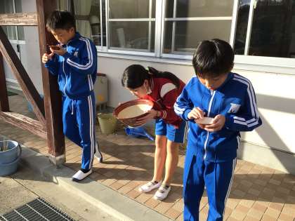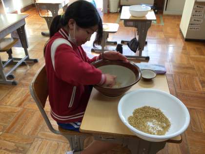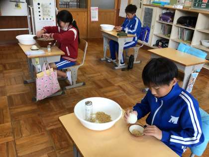 12/5(金)もみすり(5・6年生) 公開日 2025/12/05 更新日 2025/12/05 各学年から 円山学習で米づくりをしていましたが、稲穂から籾(もみ)をはずし、もみすりを手作業で行なっています。籾をすり鉢に入れ、ボールで擦ると、もみがらと玄米に分かれます。ふうっと息を吹くともみがらが飛び玄米だけがすり鉢に残ります。とても手間と時間のかかる作業ですが地道にがんばっています。とても貴重な経験です。お米にするまでのたくさんの労力が必要なことを痛感します。