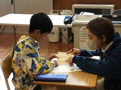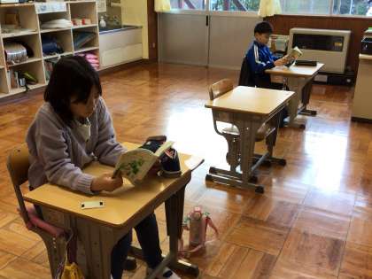 4年生も静かに読書をしています。あさがお学級では、担任の先生と聞き取り問題に取り組んでいます。