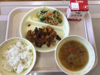 今日の給食は、レバーとさつまいもの甘辛煮、かみなり汁、昆布和え、ご飯、牛乳です。甘辛煮に入っているさつまいもは、肥料や農薬を一切使わない「自然栽培」で作られたさつまいもが使われています。「かみなり汁」は、鍋を熱してごま油を入れたところに豆腐を入れると「ジャー」「パチパチ」と大きな音がすることから「かみなり汁」の名前がついたそうです。