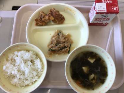 今日の給食は、もやしのナムル、とり肉のから揚げ、ワカメスープ、ご飯、牛乳です。やはり、から揚げは人気があります。