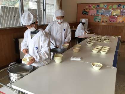 6年生、引率の先生がいないので1つのテーブルで、非常勤養護教諭の先生も一緒に食べました。
