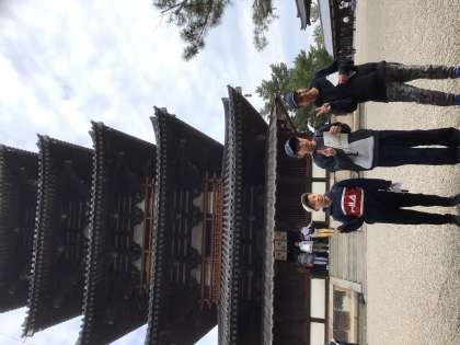予定通り、法隆寺に到着し、南大門や五重塔、金堂、大宝蔵院、夢殿を見学しました。天気が心配されましたが、風もなく、人も多くなく、数々の国宝を見学することができました。