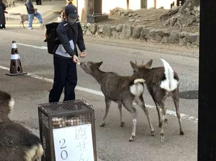 若草山に登った後、念願のシカせんべいを購入し、シカにおせんべいをあげました。シカせんべいを持っているとすぐにせんべいをねらってくるため、せんべいを持った手を上に挙げないと食べられてしまいます。食べられてしまわないように気をつけてあげていました。