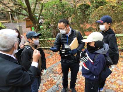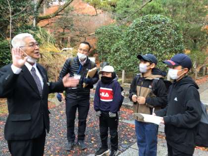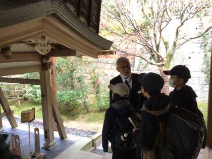 石庭で有名な龍安寺です。早い時間のためか、人も少なく、また、紅葉の木々や落ち葉のじゅうたんを踏みしめる中、龍安寺の庭楽しみました。タクシーの運転手の方が言葉にちなんだ由来をお話されるので、そのたびに子どもたちも大人もうなづきながら聞いていました。