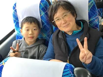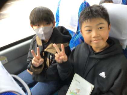 昼食後は、最後のおみやげ購入時間でしたが、おおよそ買いたいものも買い終わっていることもあり、清水坂をみんなで散策しました。最後は余裕をもって集合場所であるバスへ到着しました。写真は、バスが出発する時の子どもたちです。みんな、元気です。