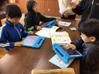 音楽「ドキドキする音楽をもとに、クロックミュージックのつくりかたを知ろう」に取り組んでいます。教科書にある二次元コードを読むと、クロックミュージックが作れる画面が出てきます。楽器の絵をタッチすると音が鳴ります。○や四角等の記号の絵を指で押さえながら円の中へ移動させると。そこで音が鳴る仕組みなので画面上で簡単に合奏ができる音楽を作ることができます。