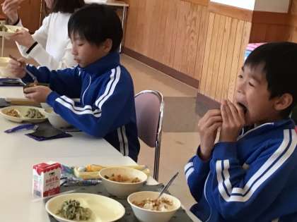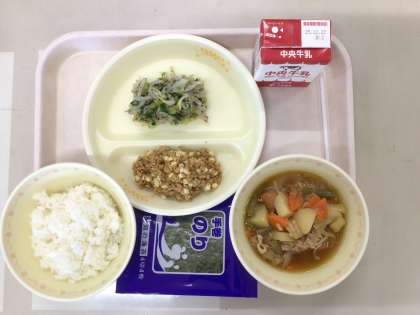 今日の給食は、納豆巻き、ゆかりあえ、肉じゃがです。