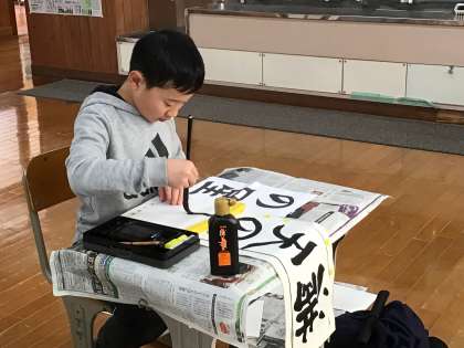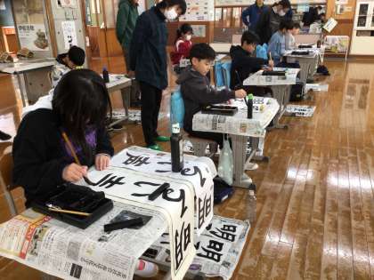 12/18(木)全校書き初め練習(6年生) 公開日 2025/12/18 更新日 2025/12/18 各学年から 今日は全校書き初め練習です。書写ボランティアの講師の方に教えていただきました。6年生は「満点の星」です。最初の「満」のさんずいの点から、筆を置く位置や筆の力の入れ具合に気をつけて練習しています。
