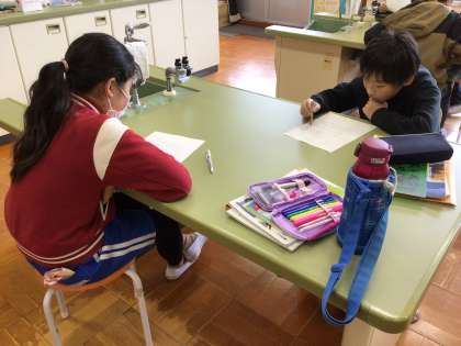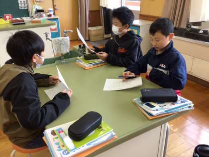授業の前に、年明けに行う「お年玉募金」と「あいさつ運動」の取組について、話し合っています。5人で仕事の分担をしています。高学年としてみんなのためになる活動に取り組みます。