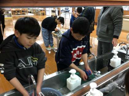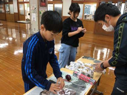 今日は冬休み前に畑で収穫したさつまいもを焼きます。さつまいもを洗ったり、アルミホイルや濡らした新聞で包んだりして、やきいもをする準備をしています。