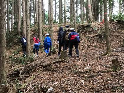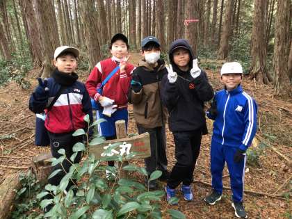 1/14(水)授業の様子(5・6年)1 公開日 2026/01/14 更新日 2026/01/14 各学年から 今日は、5・6年生が社会・総合的な学習の時間で地域の歴史を学ぶために円山城跡へ行きました。円山城は、学校の前の山の上にありますが木々が生い茂る中にあるため、学校からは見えません。枯葉や枝で埋め尽くされた細い道を歩いて行きます。また、急な斜面のため、落ちないように気をつけながら登っていきます。10分ほど、登ると本丸跡に到着しました。