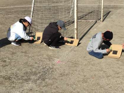 理科「日光を当てたところの明るさとあたたかさ」について取り組んでいます。虫めがねを使って太陽の光を集めて実験をしています。黒い紙に光を集めると紙が焦げてけむりが出てきます。黒い部分でなくてもダンボールでも黒色の部分よりは時間はかかりますが、同じように焦げてきます。太陽の光の強さを感じます。