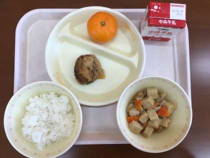 今日の給食は、えびと高野豆腐のうま煮、ハンバーグのみぞれソースかけ、ご飯、みかん、牛乳です。