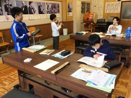 今日は音楽でリコーダーのテストがあります。テスト前の児童は、真剣にリコーダーの練習してをしています。終わった児童はほっとした表情を浮かべながら振り返りをしています。