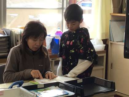 あさがお学級は算数の学習をしています。先生と対話をしながら理解をしています。