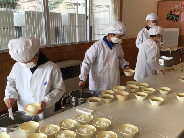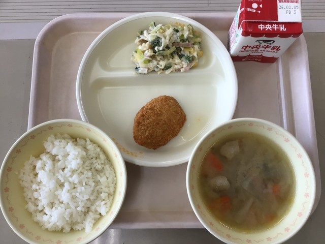 今日の給食は、さつま汁、切干し大根サラダ、かつおのミンチかつ、ご飯、牛乳です。今週は、全国学校給食週間でした。学校給食は明治22年に山形県の学校で始まったと言われています。現在の給食は、「生きた教材」として食事の手本となる役割があるそうです。