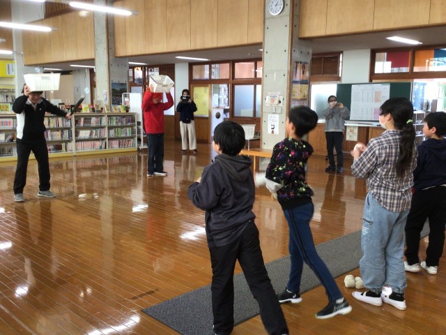 豆まきの第二弾です。豆を室内でまくと大変なことになるので、豆の代わりに玉入れの玉を使いました。一人5個ずつ玉をもち、自分のことでやっつけたいことを5つ思い浮かべ、これをやっつけられるようにカゴをめがけて投げ、カゴに入ったらやっつけられるということを行いました。子どもたちのやっつけたいことは、「ついカッとなっちゃうことや勉強をなまけてしまうこと等・・・」だそうです。鬼の格好をした先生たちが登場すると、子どもたちは大喜びでした。早速、鬼が持っているカゴをめがけて玉を投げました。最後の1個がなくなるまで投げ、見事に全部の玉がカゴに入りました。