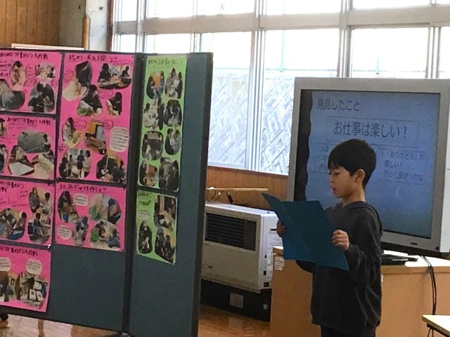 あさがお学級は、「ありがとうを伝えよう大作戦」について発表しました。「ありがとう」を伝える取組の中で仕事について興味をもち、仕事をする人へのインタビューを通して「仕事をすることは楽しい」ということに気づいたことを伝えました。声の大きさや速さに気を付けて堂々と発表することができました。