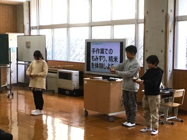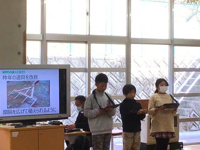 5・6年生は、「米づくりの達人になろう」「御蔵の歴史を伝えよう」について発表しました。米作りについては、2年連続で収穫できなかったため、来年度こそは収穫できるように対策を考えたいことを伝えました。また、身近にあった「防空壕」から戦争への関心を高め、戦争についてもっと知り、伝えていきたいということを発表しました。米作りも戦時中のお話も地域の方に教えていただきながら学習を進めることができました。ありがとうございました。