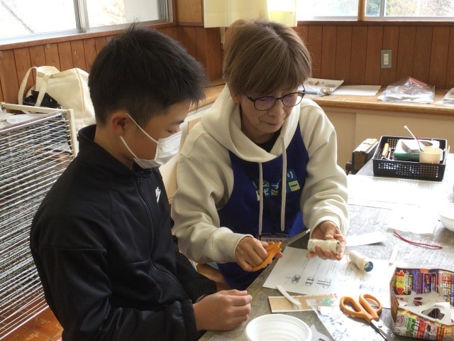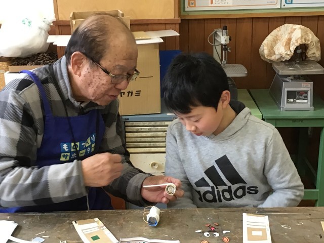 今日はものづくりサポーターの方が7名みえて、とても手厚く教えていただきました。「からくりのしくみを学ぼう」を目当てに、前半は「輪ゴムぜんまい作り」、後半は「クランク作り」と、ぜんまいの仕組とくらんクランクの仕組を活用しておもちゃ作りに取り組みました。