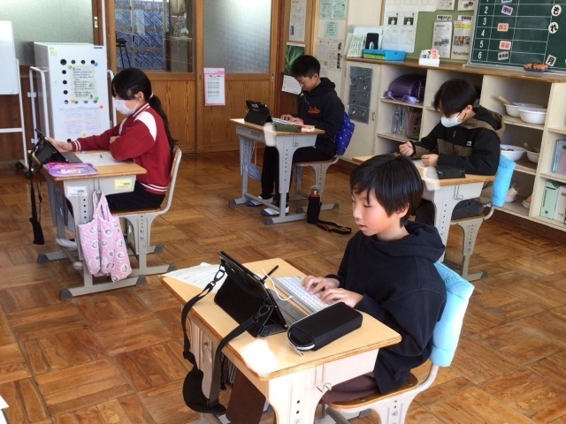 5・6年生は、円山文集に載せる作文を書いています。「はじめ なか おわり」の文の構成を考え、その後、考えた文を学習用タブレットに打っていきます。なかなか苦戦しています。いろいろ思い出しながら文を考えています。