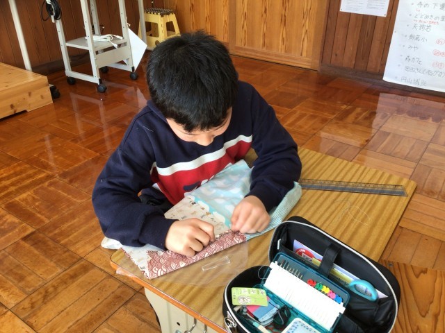ひまわり学級は、家庭科で箸セット袋を作っています。4種類の布を中表にして縫い合わせてリバーシブルになるように作っています。リッパーの使い方が上手です。出来上がりが楽しみです。