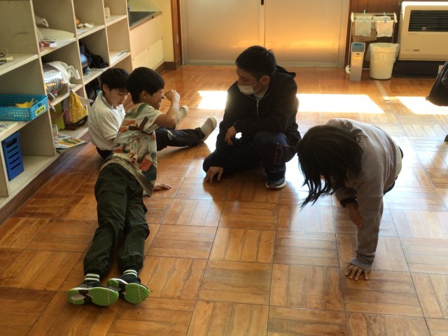 4年生は、理科「体と運動  力を入れると見た目がどう変わるか観察しよう」に取り組んでいます。床に手をついて腕に力を入れるとどんなふうになるか、腕の様子を見たり触ったりして違いを考えていますの