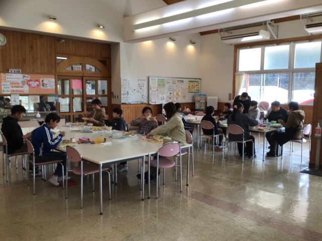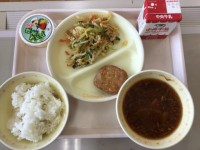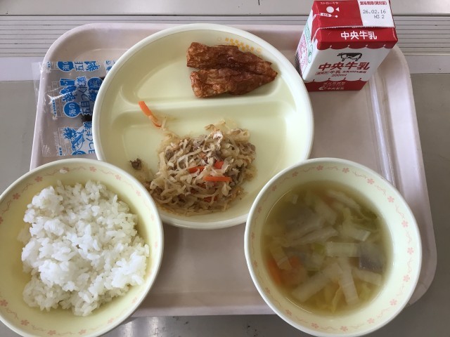 今日の給食は、切り干し大根の炒め煮、ちくわの天ぷら、呉汁、海の五目佃煮、ご飯、牛乳です。「海の五目佃煮」には、昆布、のり、ひじき、わかめと、4種類の海藻が入っています。呉汁にも、大豆、はくさい、にんじん、こんにゃく、ネギ、じゃがいもと、6種類の具が入っていて栄養がたくさんとれます。
