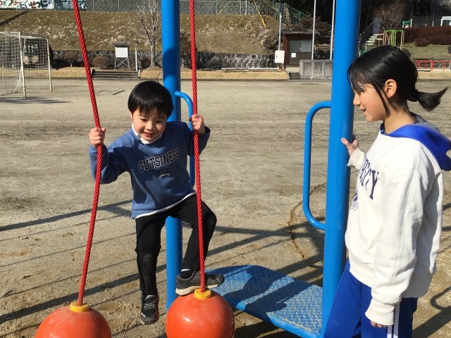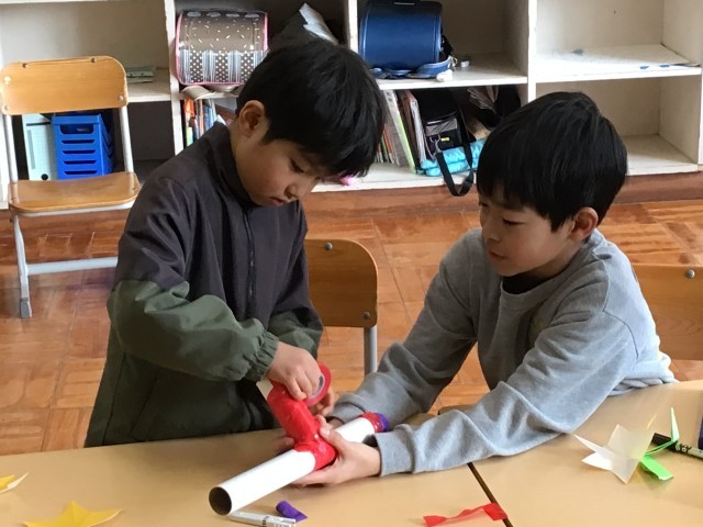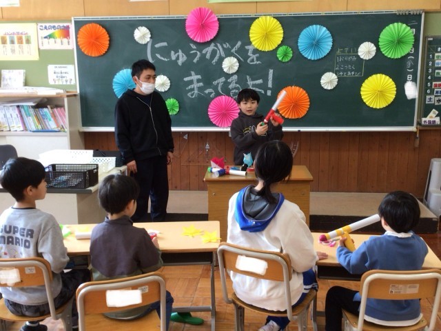 今日は入学説明会があり、新入学児と保護者が来校しました。保護者説明会の時間には4年生と新入学児との交流時間がありました。4年生はこの日のために、新入学児が喜んでくれるようにと何ができるか考えて準備しました。「おりがみ」「空気てっぽうづくり」「外遊び」の3つを考え、楽しんでもらいました。とても喜んでもらえたようで、4年生の児童もうれしそうでした。