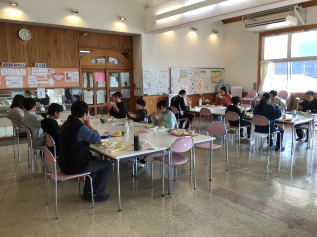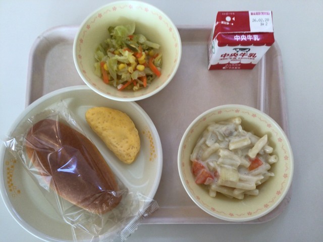 今日の給食は、マカロニのクリーム煮、オムレツ、フレンチサラダ、米粉パン、牛乳です。米粉パンには豊田市の特産物である「大地の風」のお米が使われています。