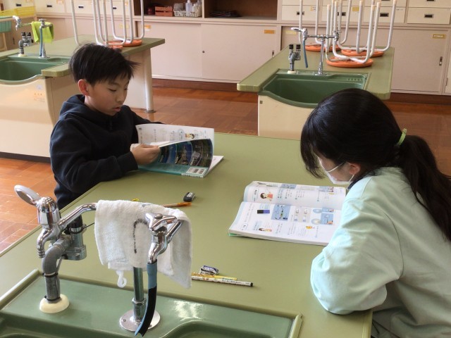 理科の授業です。単元テストを終え、先生が採点をしています。その間に教科書を読んでいます。とても静かに集中して取り組んでいます。