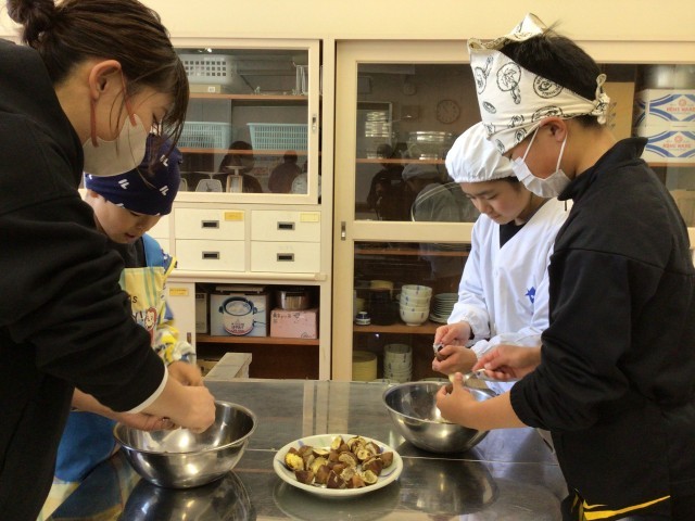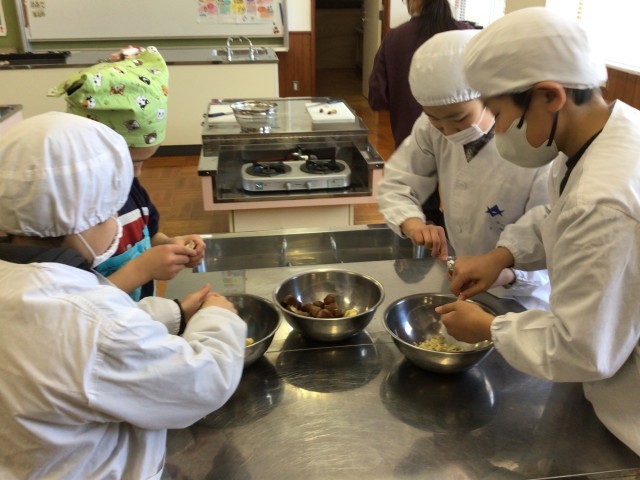 今日のみくらタイムに栗きんとんづくりをしました。秋に収穫した栗を冷凍しておき、茹でました。子どもたちは栗の中の実をスプーンでくり抜く作業に取り組みました。とても手際よくくり抜き、あっという間にたくさんの栗の実を取り出しました。これに砂糖を入れ、火にかけて砂糖を溶かして実に馴染んだら、きんとんの形につくっていきます。