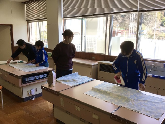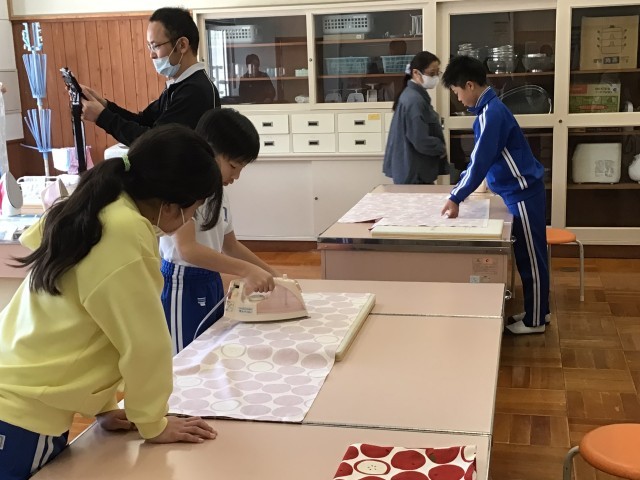家庭科の時間に、トイレののれんを作っています。高学年として、学校のために何かできることはないか考えて、のれんを作ることになりました。