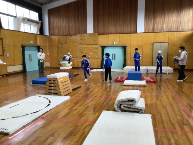 今日の課題は、台上前転に挑戦しようです。跳び箱、マットを、さまざま配置してあるので、子どもたちは自分に合った場所を選んで練習しています。伸膝台上前転や首はね跳びに挑戦している子もいました。