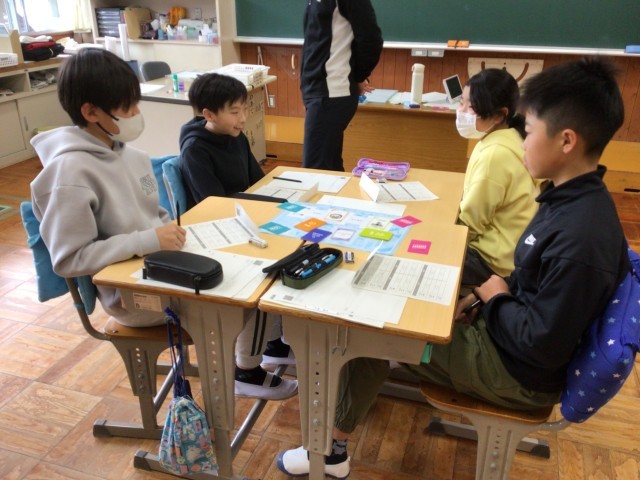 5・6年生は、国語の授業で話し合いの学習をしています。経済についてカードを使いながら意見を言ったり聞いたりしています。こういった学習を通して、こういった場の設定がなくても、話し合いがスムーズにできるようになる力をつけていきたいです。